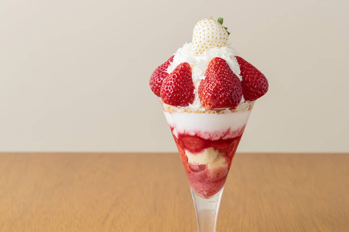 白と赤のコントラストがひときわ目を惹くビジュアルのパフェ。