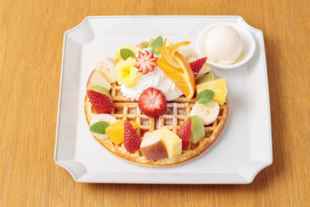当店自慢のオリジナル生地を使用したふわふわ食感のワッフルに季節のフルーツを贅沢にトッピング。