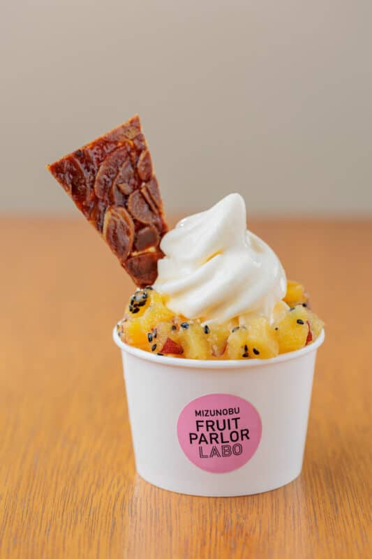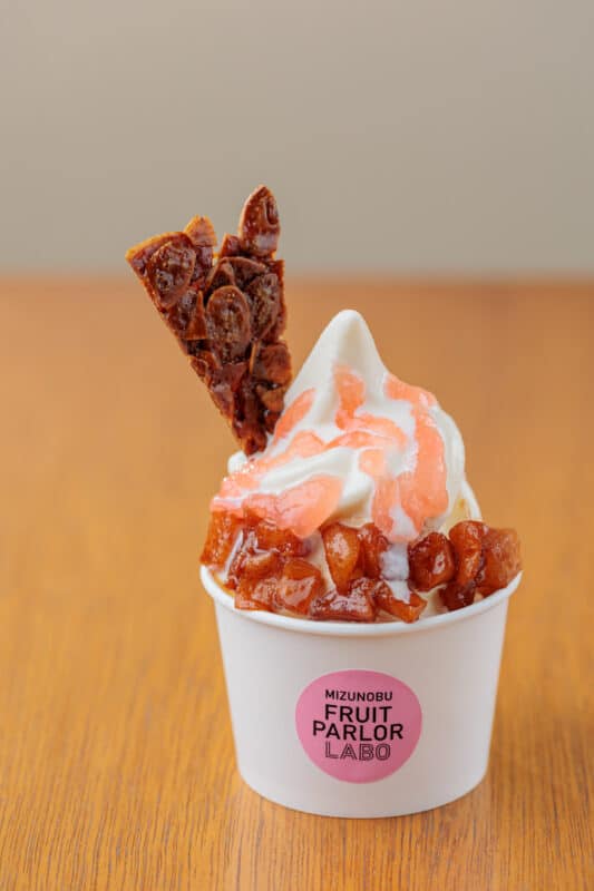 さつまいものアイスクリームとみたらしソース、ダイスカットしたさつまいもを合わせ、フロランタンを添えました。