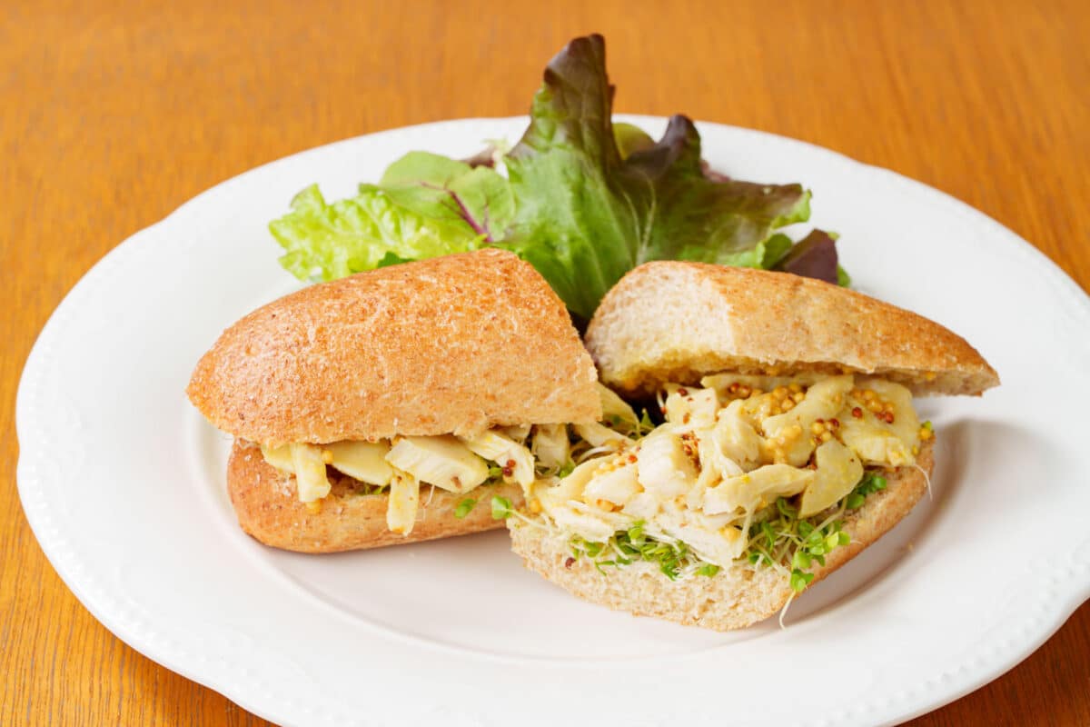 焼きたての桐生酵母ロールパンにマスタードチキンとクリームチーズをサンドしました。