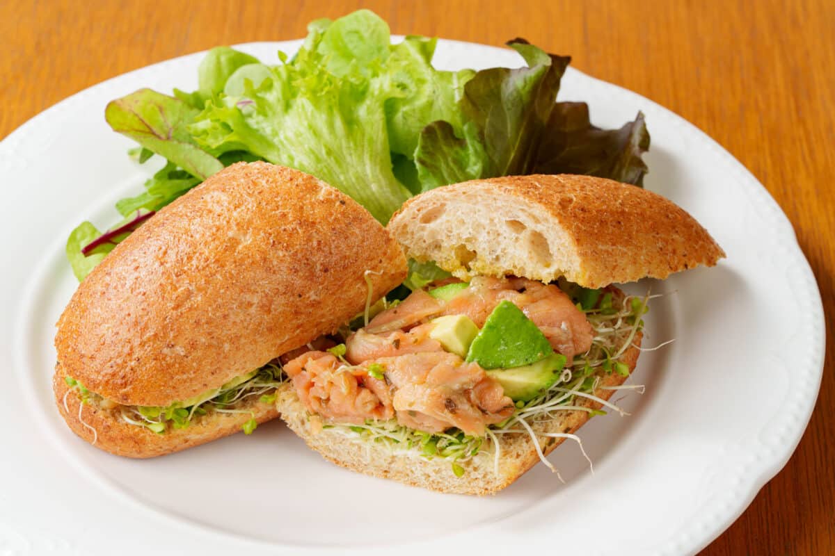 焼きたての桐生酵母ロールパンにサーモンとアボカドをサンドしました。