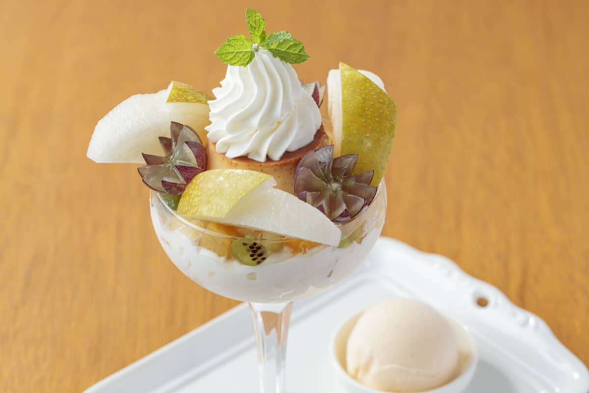 季節ごとの美味しいフルーツを添えたプリン・ア・ラ・モード。10月17日からは、洋梨と葡萄の瑞々しさをお楽しみいただけます。
