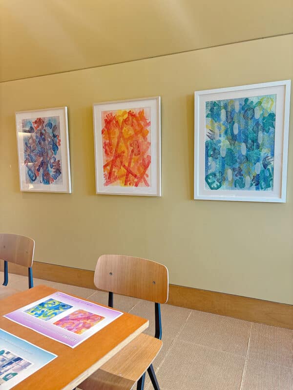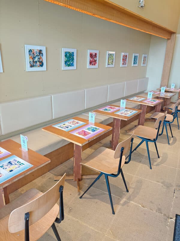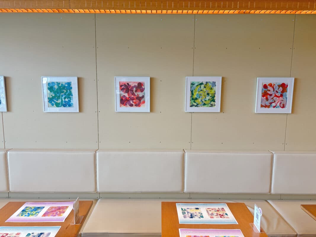 LIU氏の柔らかな色彩の作品に囲まれた店内でティータイムをごゆっくりお過ごしください。