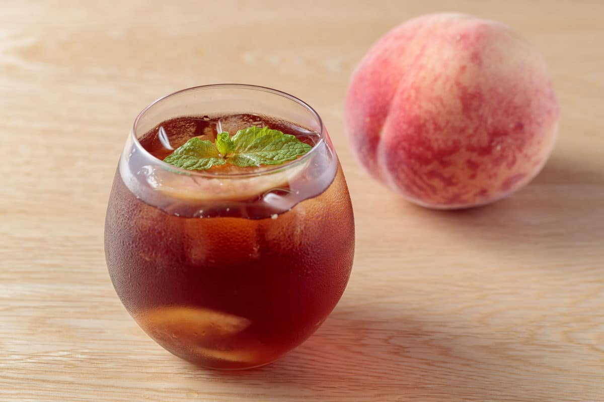 桃シロップを加えてアイスティーに桃の果肉を入れた食感と風味広がるドリンクです。