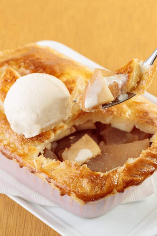ご注文をいただいてから焼き上げるので、いつでも焼き立てでご提供いたします。熱々のアップルパイに冷たいバニラアイスをのせてお楽しみください。